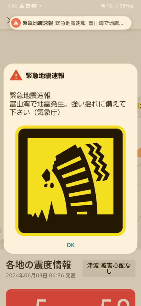 実は2023/5/5の地震のときも石川に来ていて、その時とほぼ同じ震源だったため、落ち着いて対処していました。